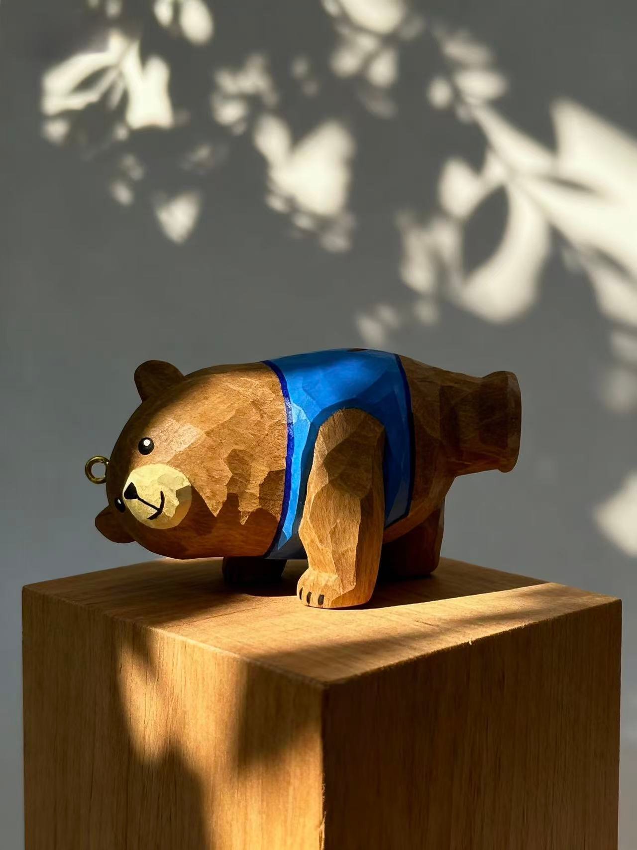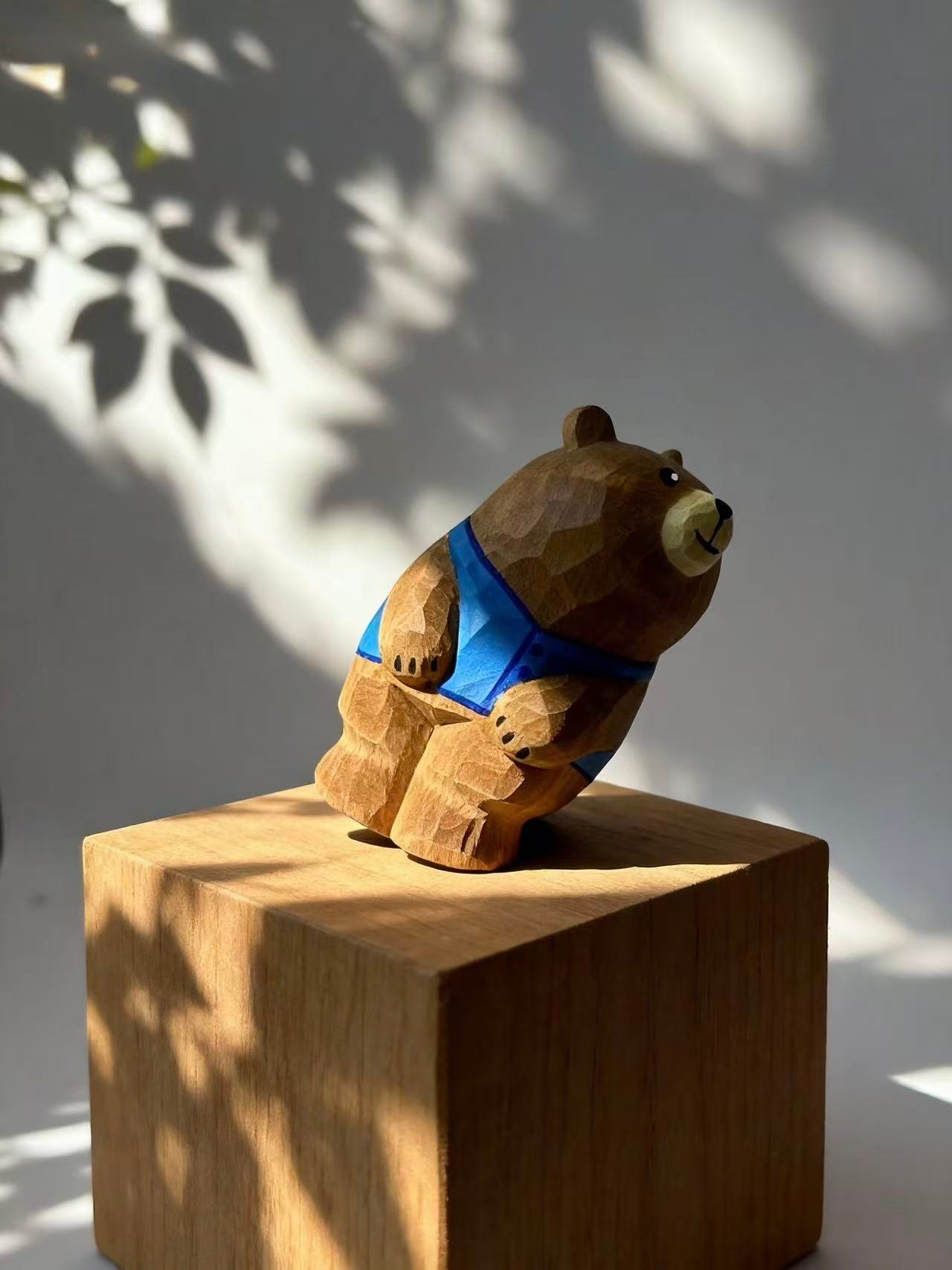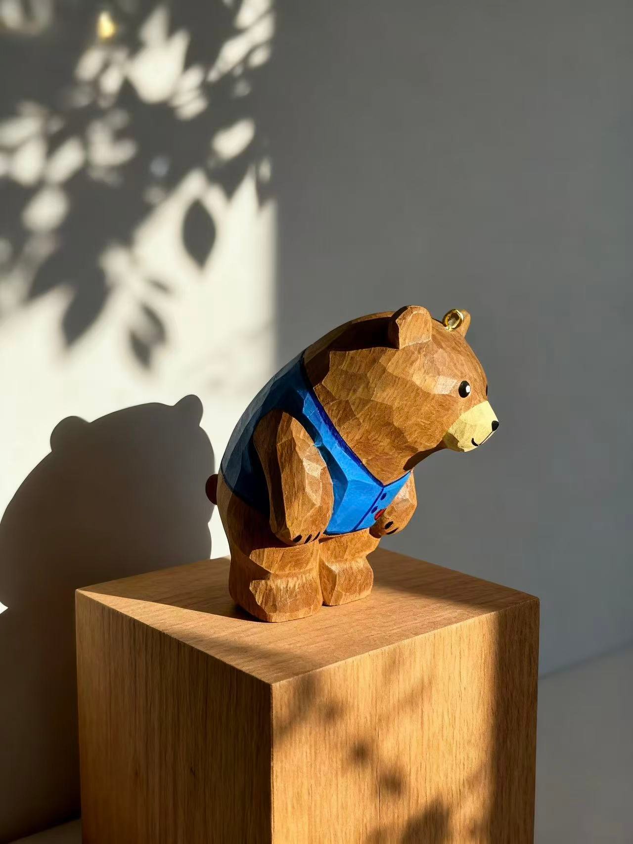 A hand‑carved wooden bear figure with faceted texture and a painted blue vest. Cozy, compact, and versatile—perfect for gifting or adding woodland charm to any space.
