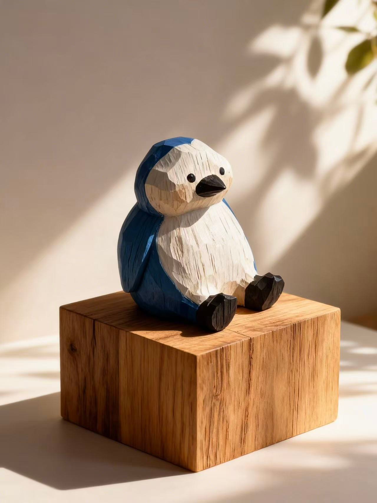 A tiny blue penguin carved from wood, shaped with soft curves and painted in gentle cool tones. Its round body, small wings, and calm expression give it a peaceful presence—like a little friend from a quiet, snowy world. The subtle gradient of blues and whites adds depth, while the hand‑carved texture brings warmth to its icy palette.