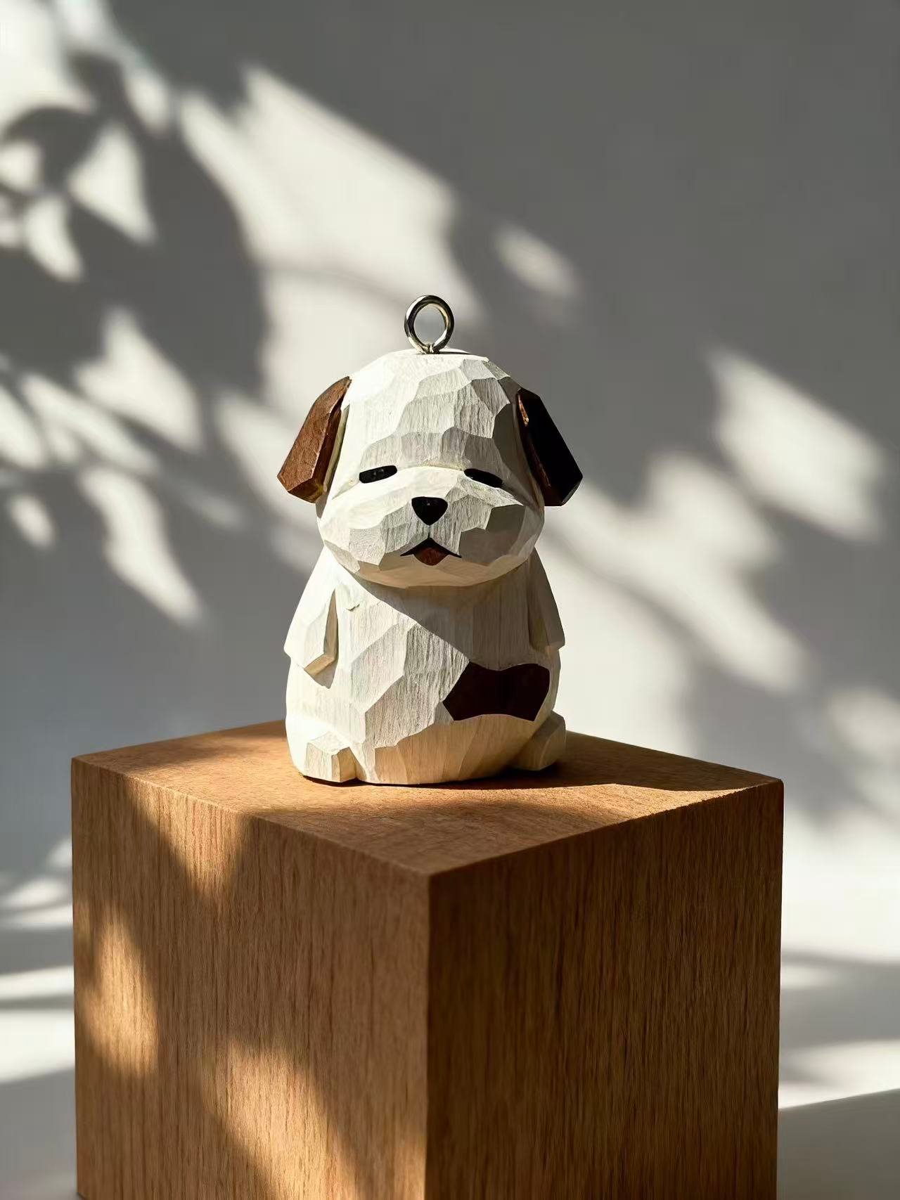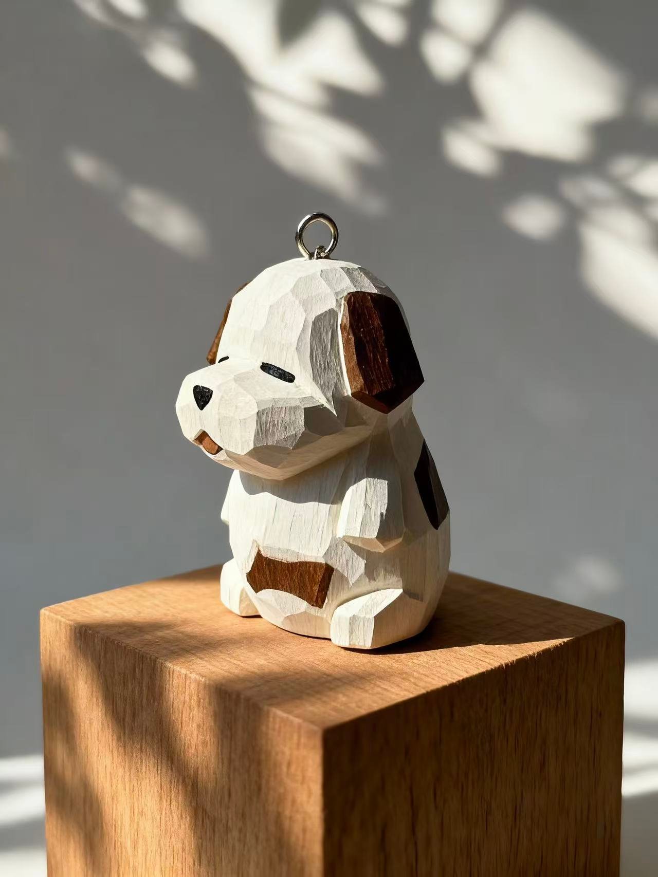 This hand‑carved Calm Pup from Carved Tales features soft white and brown tones, a peaceful expression, and a minimalist silhouette. Its faceted texture adds a modern touch, while the tiny loop makes it easy to hang or display. Whether gifted to a dog lover or kept as a personal charm, it brings a sense of calm and companionship to any space.