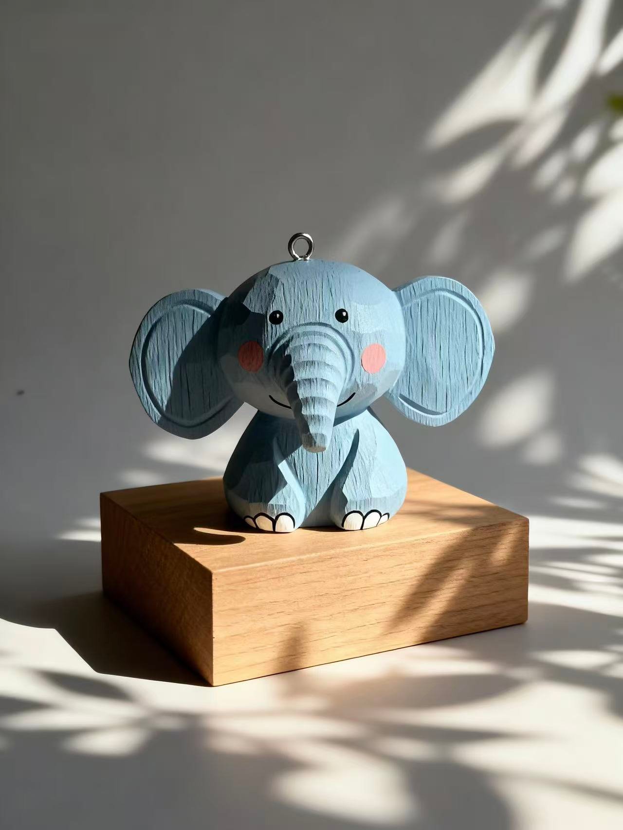 This hand‑carved wooden Elephant is painted in a calming pastel blue with rosy cheeks and playful details. Its rounded shape and oversized ears give it a warm, friendly presence that brightens any room. Whether displayed on a shelf, added to a collection, or hung using its built‑in loop, this little figure brings a touch of joy and serenity wherever it goes.