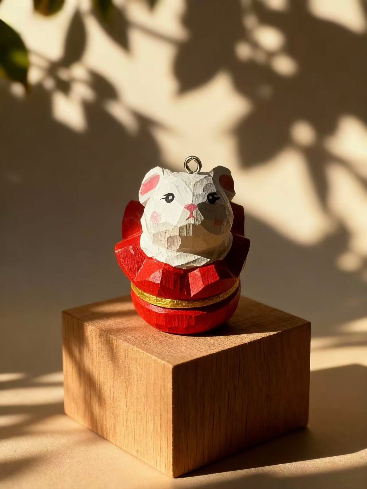 This hand-sized Facet Mouse is sculpted from solid wood and finished with a glossy red-and-gold lacquer. Its geometric surface catches the light, while its playful charm makes it perfect for gifting or display. Whether hung on a tree or perched on a shelf, it brings a touch of tradition and whimsy to any space.