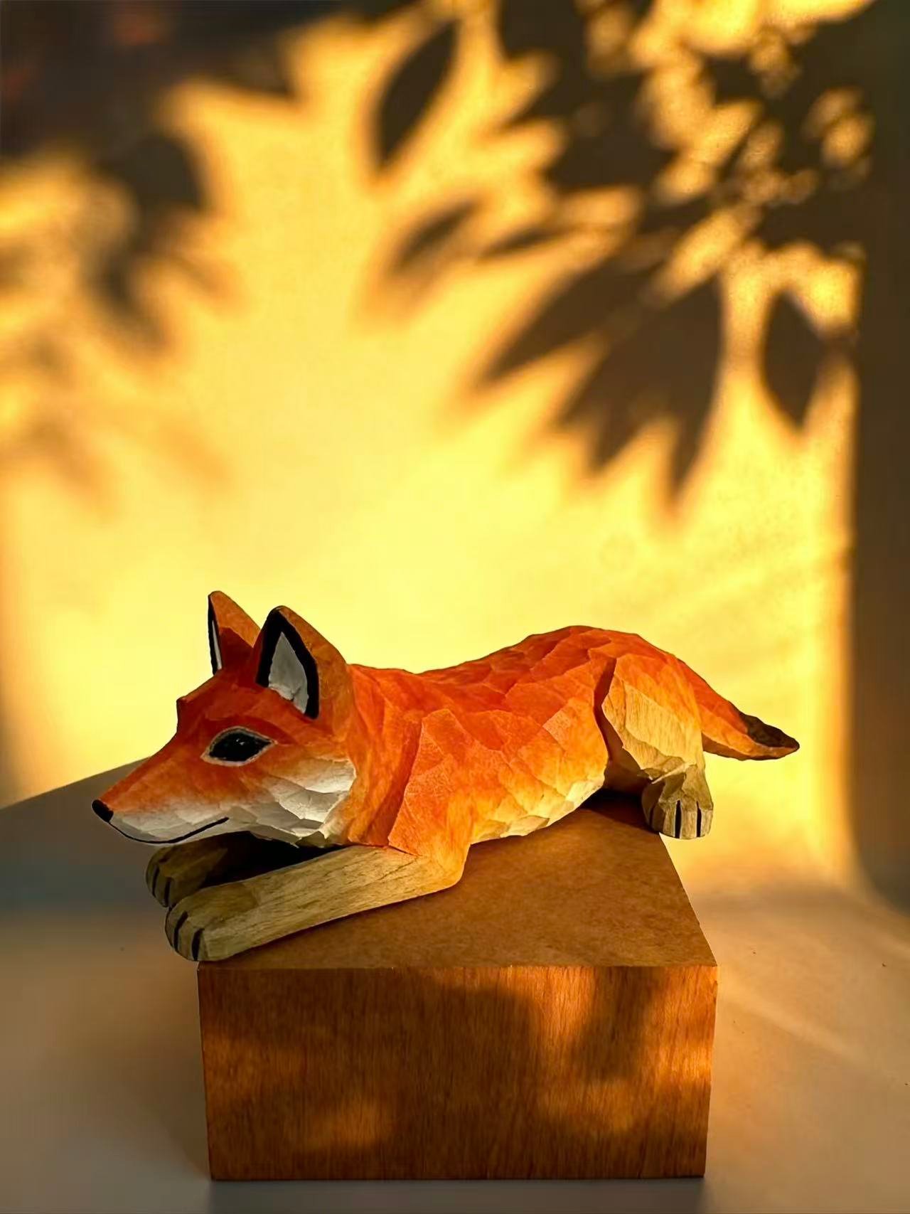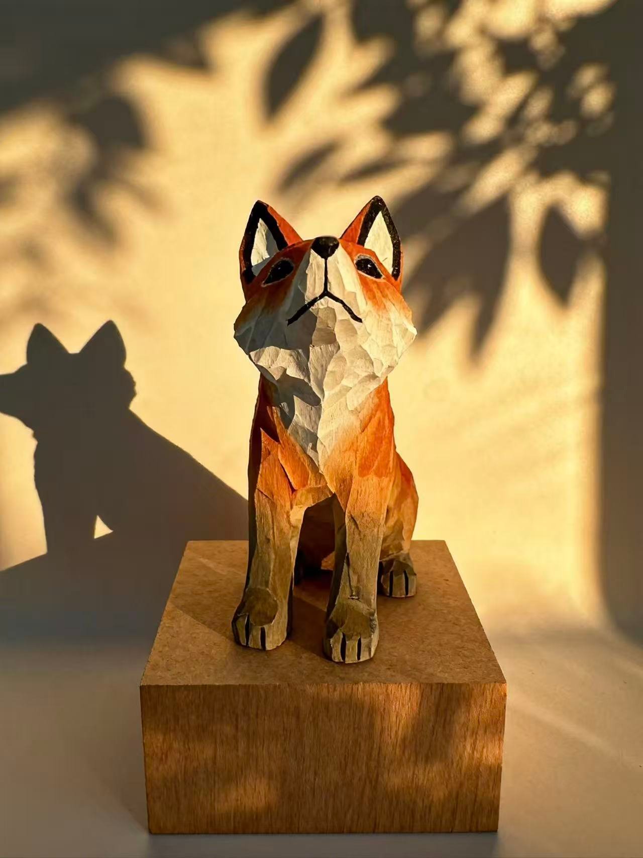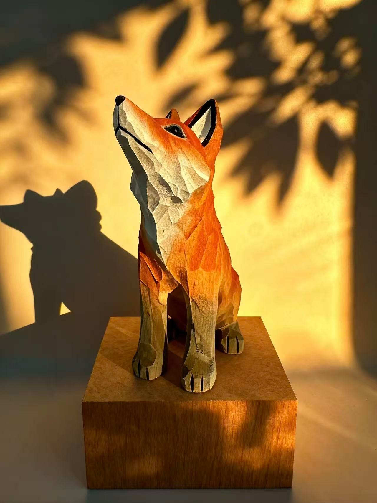 A fox carved in faceted wood—angular, elegant, and full of quiet motion. Painted in warm orange, red, and white tones, this sculpture captures the spirit of the forest with a modern twist. With its upward gaze and clean lines, it adds a touch of nature and design to any space.
