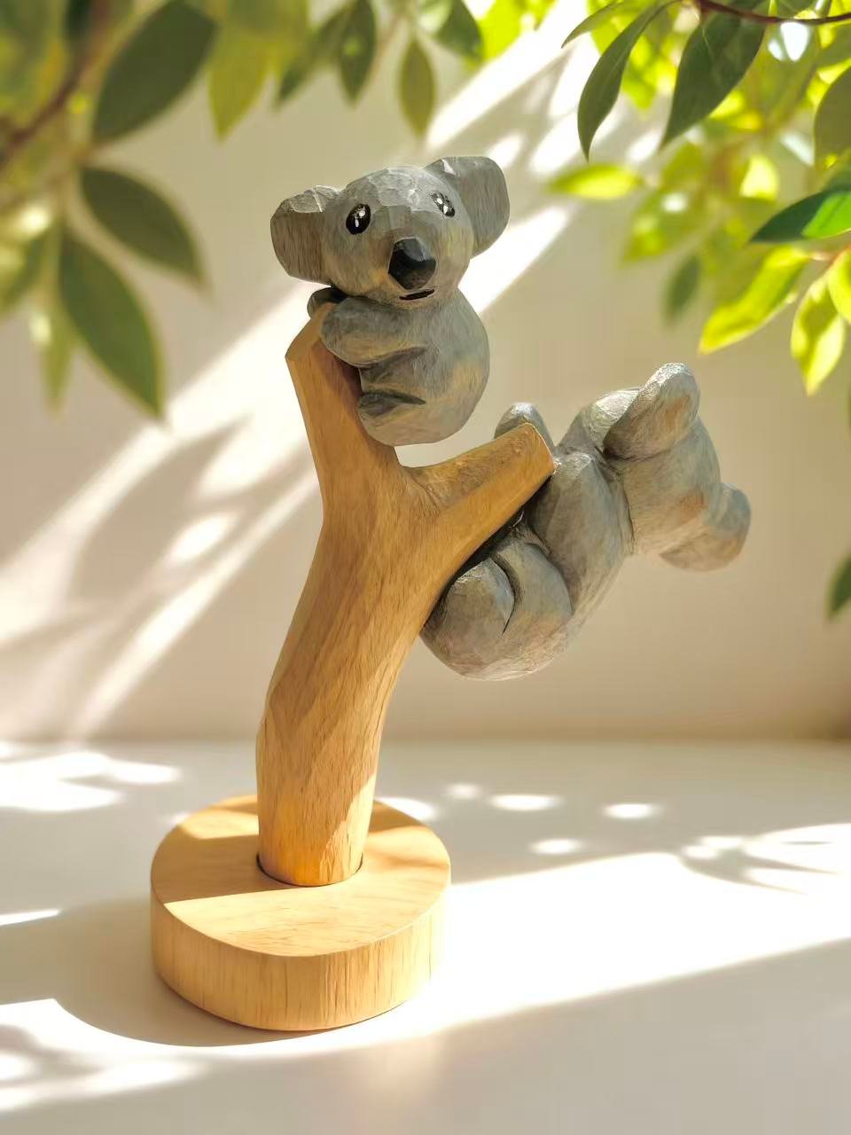 A hand‑carved koala pair on a tree branch—warm, gentle, and full of charm.