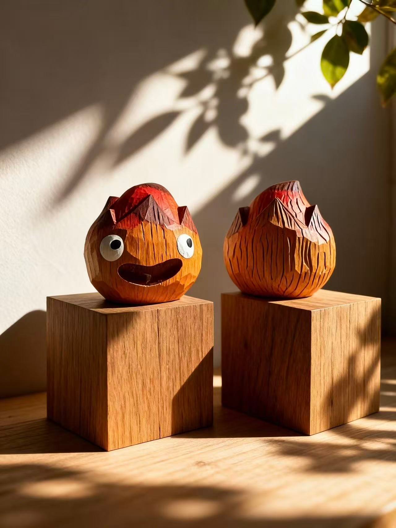 A tiny fireball creature carved from wood, glowing with warm reds and oranges. With its round shape, bright expression, and flickering flame‑like details, this figure brings a spark of energy to any space. Cute, lively, and full of handcrafted charm—perfect for shelves, desks, or fantasy‑themed collections.