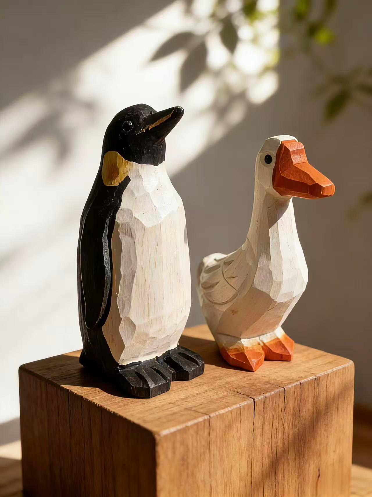Hand‑carved details and subtle shading give both figures a warm, organic texture. Together, they form an unexpectedly harmonious pair: one from icy seas, one from quiet ponds, yet perfectly balanced when placed side by side. Whether displayed as a duo or separated into different corners of a room, this penguin and duck set brings a sense of sweetness, contrast, and handcrafted warmth to any space