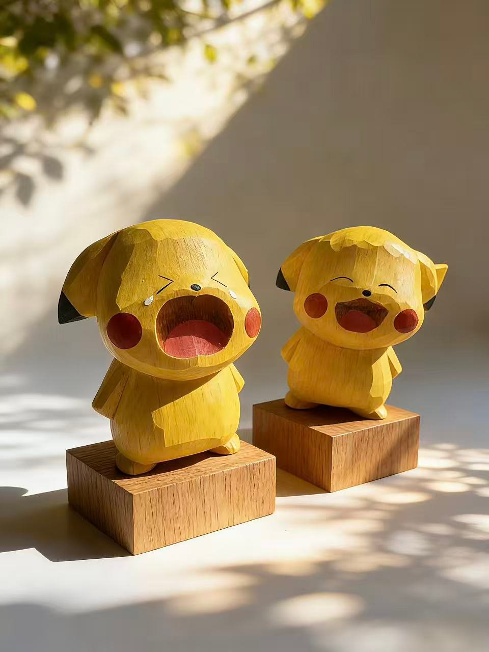 Hand‑carved curves and subtle tool marks give the sculpture a cozy, organic texture, while the expressive eyes and playful posture add personality and charm. Whether displayed alone or paired with other character figures, this Pikachu brings a sense of warmth, nostalgia, and handcrafted sweetness to any shelf or desk.
