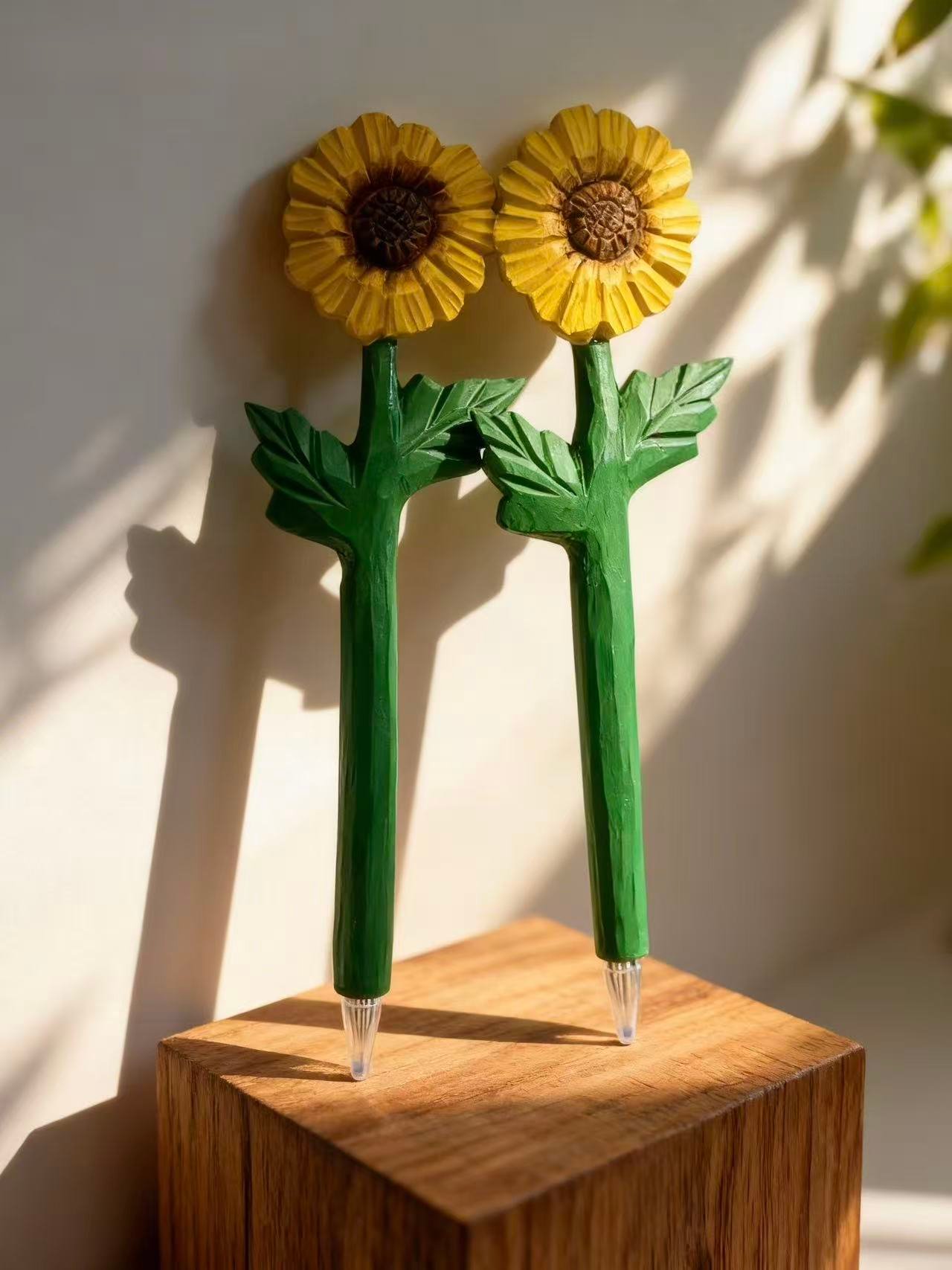 A wooden pencil topped with a tiny sunflower, carved with soft curves and painted in warm, glowing yellows. The sunflower’s petals open gently like a small burst of sunshine, bringing a cheerful, uplifting touch to your desk or workspace. The stem of the pencil keeps a natural wooden texture, creating a cozy balance between function and handcrafted charm.