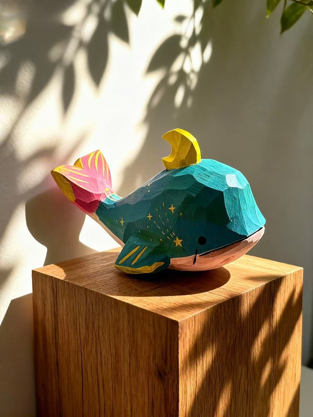 Two tiny whales, one pink and one blue—each hand‑carved with geometric texture and golden accents. With playful horns and cheerful colors, this duo brings a splash of fantasy to your shelf. Whether seen as sea creatures or dream companions, they’re full of charm and ready to brighten any space.